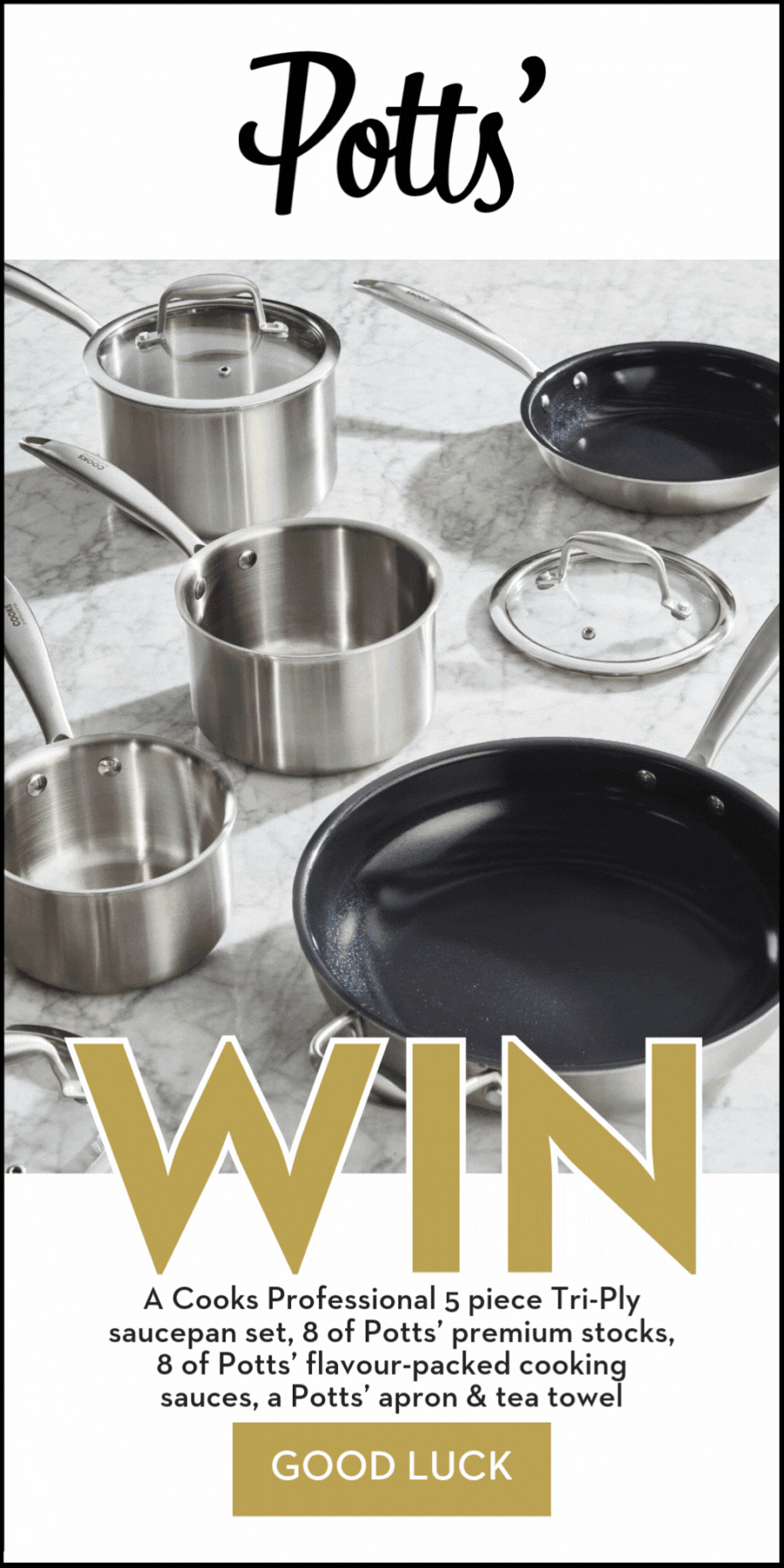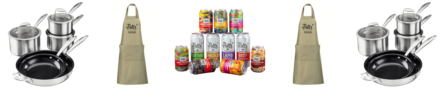 In collaboration with Potts', we’re giving one lucky winner the perfect January Kitchen bundle worth just under £300, including a Cooks Professional 5 piece Tri-Ply saucepan set and a generous selection of Potts’ gourmet stocks and sauces – perfect for trying out some fresh new recipes in the New Year. You’ll also receive a Potts’ apron and tea towel, so you can create, stir and serve in true chef style. With eight cans of Potts’ premium stocks and eight cans of their flavour-packed cooking sauces, your kitchen will be stocked and ready for the New Year.