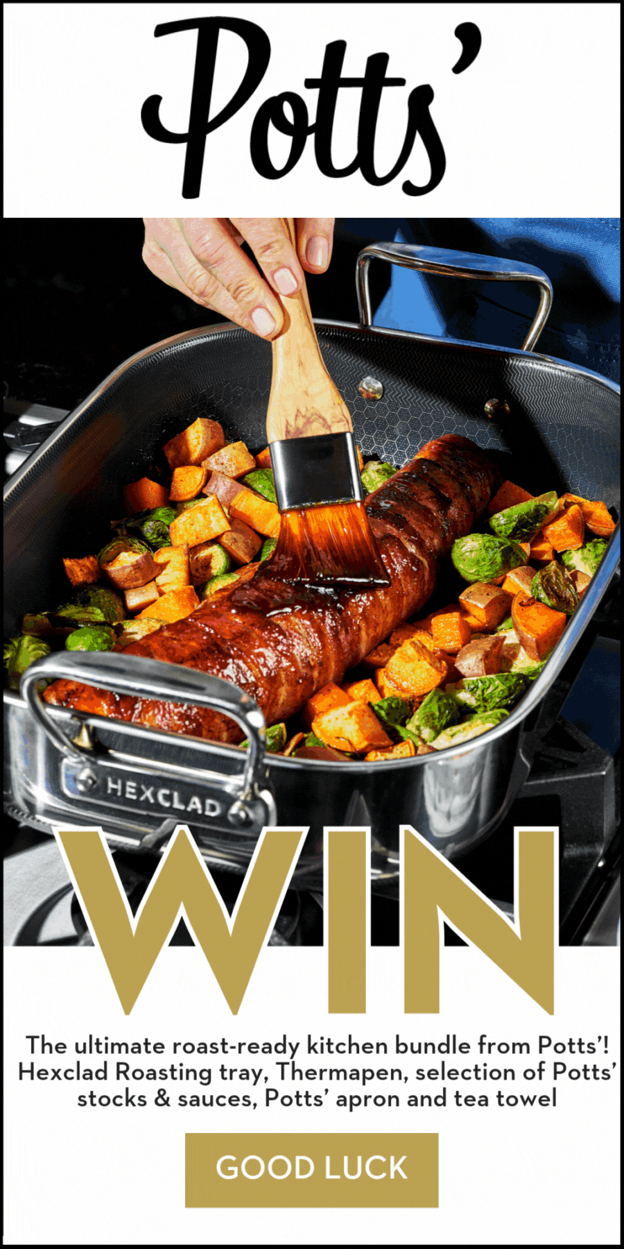 Bring Sunday roasts to perfection with Potts’. We’re giving one lucky winner the ultimate kitchen bundle worth over £280, including a Hexclad roasting tray, a thermapen, and a generous selection of Potts’ gourmet stocks and sauces – the essentials for rich gravies, glossy reductions and beautifully balanced flavours. You’ll also receive a Potts’ apron and tea towel, so you can carve, stir and serve in true chef style.