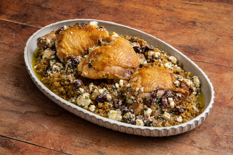 Remove the lid and nestle the chicken thighs into the freekeh. Cook for a further 5 minutes, uncovered, or until the freekeh is done