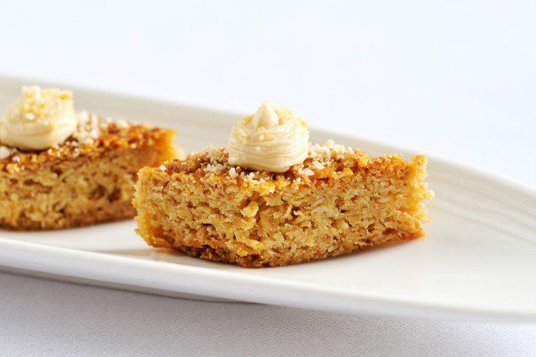 This much loved flapjack recipe is a great way to use up spare porridge oats. Here they are presented as tiny, elegant squares to make the most cheeky of flapjack petit fours. In this easy baking recipe from Nathan Outlaw, they are finished off with a mischievous piping of brown sugar icing.