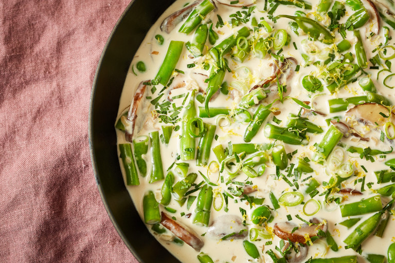 This comforting summer dish really celebrates the verdant vegetables of the season. Vibrant broad beans and green beans are kept al dente to provide crunch amid the richness of the cream, and plenty of herbs and lemon zest keep this vegetarian dish light and fresh.
