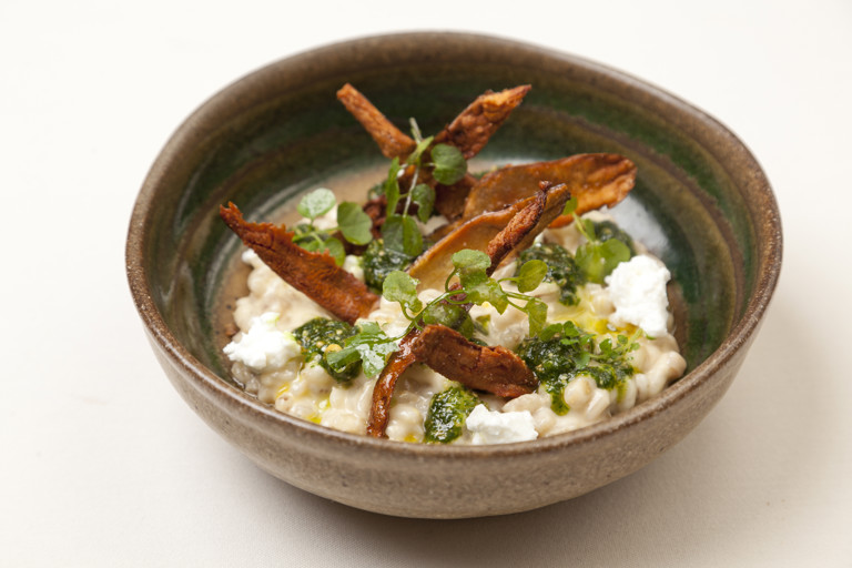 David Everitt-Matthias' triumphant Jerusalem artichoke orzotto recipe is packed with hidden delights – nuggets of goat's cheese, crispy Jerusalem artichoke skins and a heavenly parsley and peanut pesto. Make the pesto the day before to save time and allow the flavours to develop.