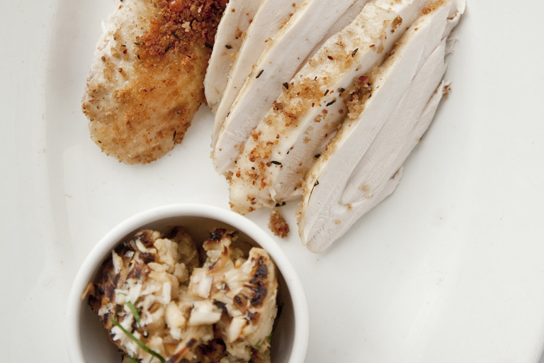 Bored of the standard roast chicken recipe? This distinctive Marcus Wareing whole chicken recipe double-cooks the chicken by poaching and then roasting the bird, resulting in remarkable flavour. The thyme and almond crust is another exciting twist for this chicken, which is paired with chargrilled cauliflower, but you could easily swap the cauliflower out with some of your favourite sides.