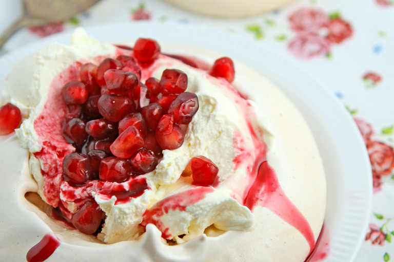 I don’t really mind where the recipe came from – I just know it is one of the easiest and most versatile desserts I know. I have made it with a variety of fruit, but for this time of year, pomegranates are my favourite – particularly as they are associated with romance and Valentine’s day. I made my own pomegranate syrup but if you are pushed for time you could buy ready made pomegranate molasses. Do make your own meringues though – they are always worth the extra effort!