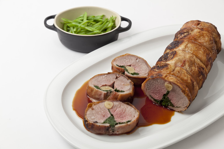 Give Sunday lunch a new lease of life with this roast lamb recipe by Adam Gray. The lamb is stuffed with garlic cloves and spinach, and served with sautéed potato slices and greens. If you can’t get Lune Valley lamb, ask for a good quality boned saddle from your butcher and ask them to chop the bones for your stock.