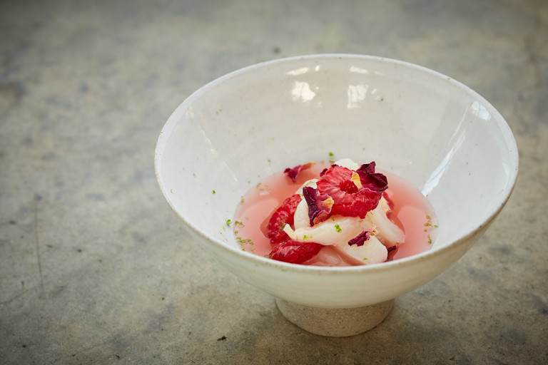 This little bowl of raspberries and lychees in a clear raspberry and rose elixir makes the perfect pre-dessert when hosting an all-guns-blazing dinner party. Make the elixir in advance and simply assemble before serving.
