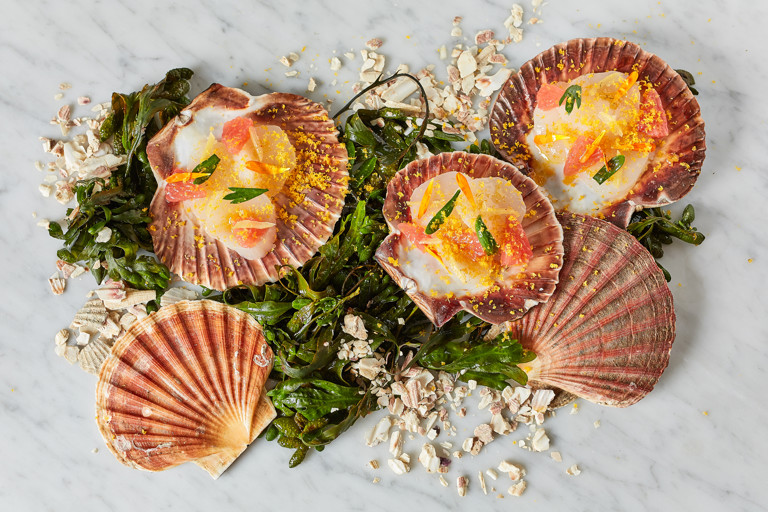 This simple scallop recipe sees the noble shellfish served raw with pieces of pink grapefruit, salty rock samphire leaves, floral chrysanthemum petals and a smattering of grated bottarga. Ready in minutes, it's a showstopping way to start a dinner party. Watch our video on how to segment a grapefruit if you're not sure how to do it.