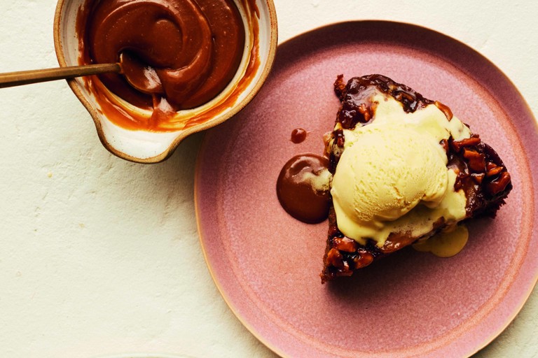 Nicola says: 'I was never a fan of upside-down cakes until I realised one very important detail: they MUST be eaten warm. This is somewhere between a cake and a hot pudding – the sort of thing to serve at the end of lunch. The cake comes together in less than 5 minutes in a food processor, too! I’m always surprised at how far a small amount of buckwheat flour goes. Just a tablespoon in this recipe lifts it and gives the most delicious potent flavour. If you don’t have any open, you could sub for more ground walnuts or flour.'